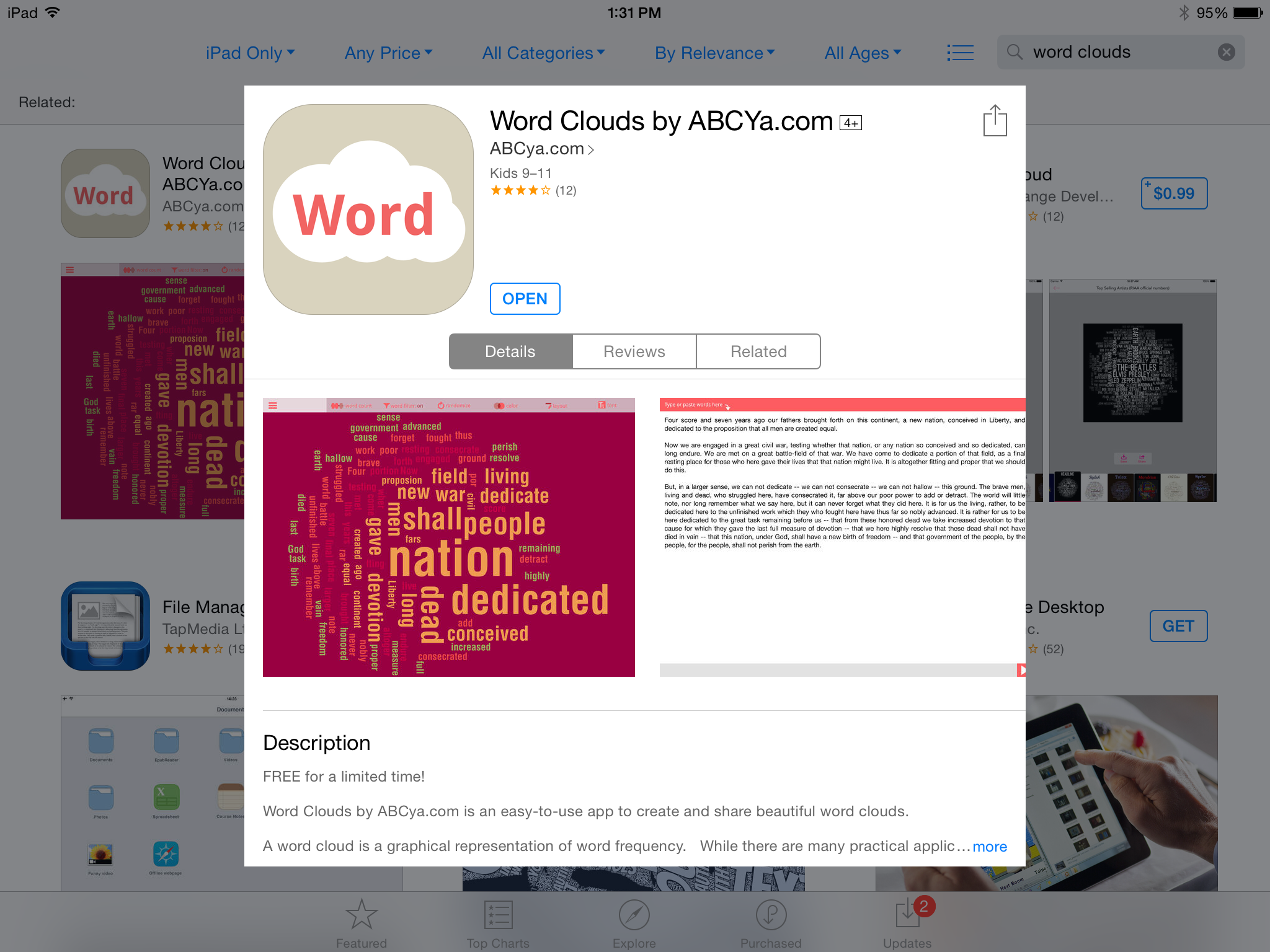The other app I shared was Word Clouds (Apple only, though if you search “Word Cloud” in the Google Play store, the first app that comes up is very much like Word Clouds). With Word Clouds, students can make word art out of their writing. I will be having students type their stories into Word Cloud and creating word art to display in the classroom. I will share some of their work here as well as soon as they are done. Word Cloud is a free app.