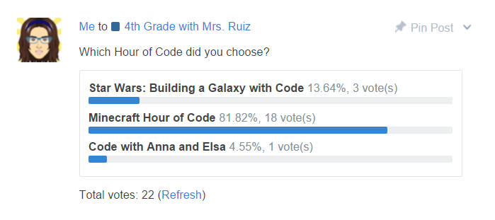 I shared the Code.org website with them and there they got to choose from three tutorials: Star Wars, Minecraft, or Frozen. I had them share their selection with the class via an Edmodo poll and after the hour in the lab, they were to return to my post in Edmodo to share their experiences.